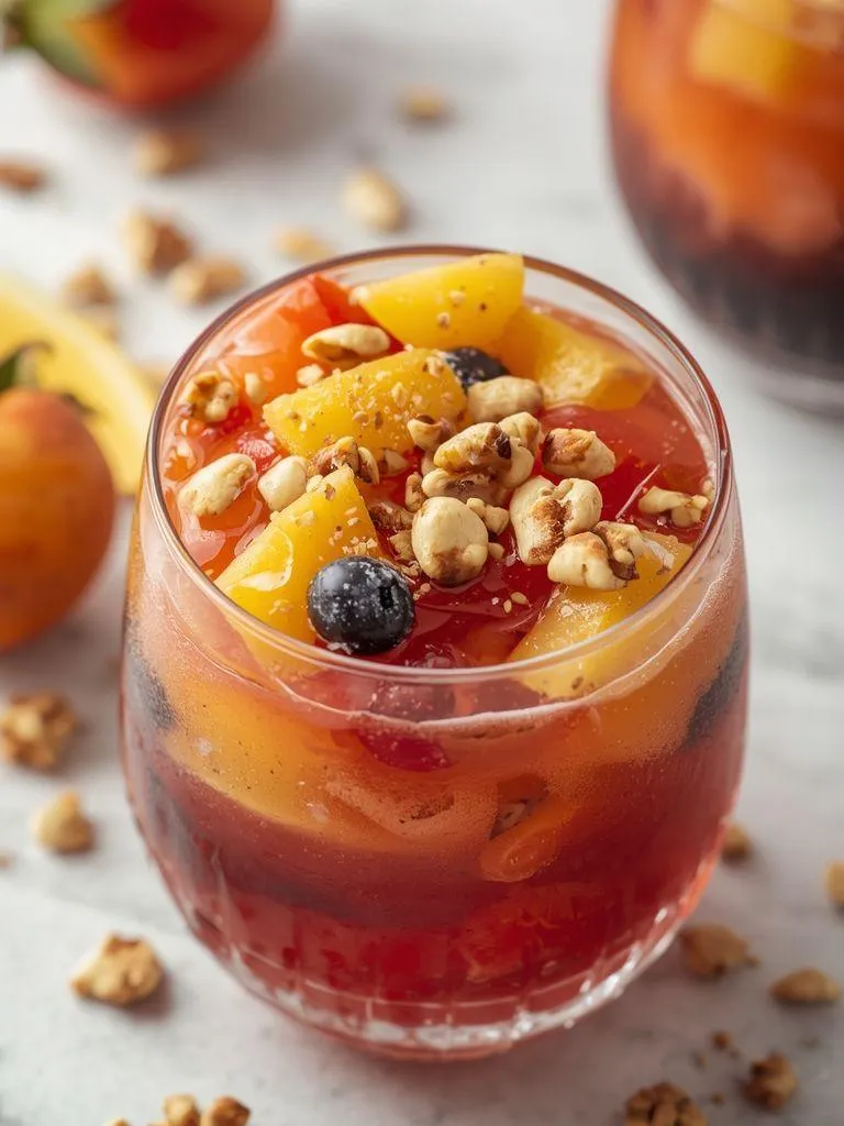 Blend all the fruits until smooth. Sprinkle the finished cocktail with chopped nuts and, if desired, dilute the cocktail with water.