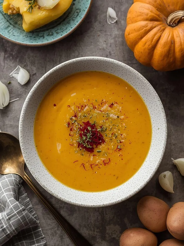 Puree the soup with a hand blender, adding the milk. Heat the pumpkin soup again, but do not let it boil, and season with salt, nutmeg and thyme.