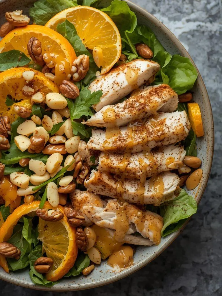 Salad with chicken, orange, and nuts with honey-mustard sauce and cinnamon
