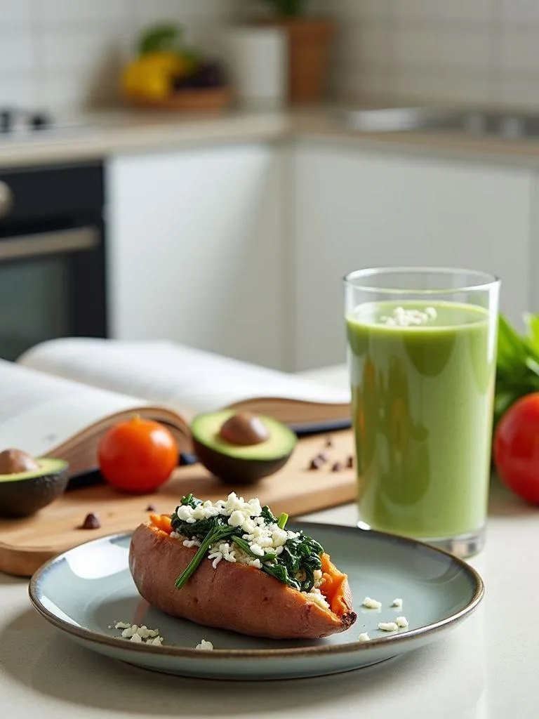 Składniki na 1 porcję: - 1 średniej wielkości batat, - ¼ puszki cielęciny, - 1 ząbek czosnku, - 2 garści szpinaku, - ½ kulki mozzarelli, ok. 50 g, - 50 ml sosu pomidorowego, - oliwa z oliwek, - przyprawy: sól, pieprz, bazylia, kumin, oregano. Umyty batat przekrojony wzdłuż, posmarowany oliwą, lekko nacinany i posypany przyprawami piecze się w piekarniku nagrzanym do 180°C. W międzyczasie przygotowujemy farsz z cielęciny, czosnku, szpinaku i przypraw, który po upieczeniu dodajemy do batata. Batat wypełniony farszem i posypany mozzarellą jeszcze kilka minut piecze się w piekarniku. Można podawać z jogurtem lub sosem tzatziki.8. Składne smoothie z awokado