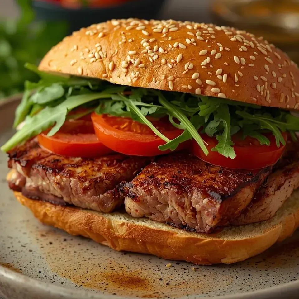 Kanapka z pieczonym schabem, rukolą i pomidorami