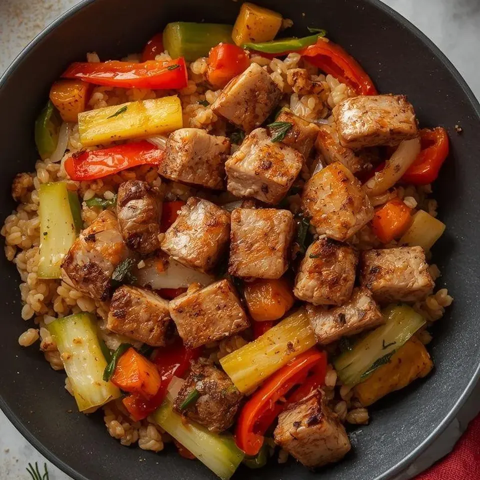 Kasza gryczana z piersią z indyka i warzywami na patelnię