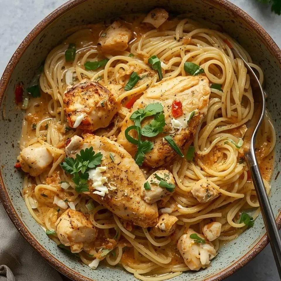 Spaghetti pomidorowo-bazyliowe ze szpinakiem i kurczakiem