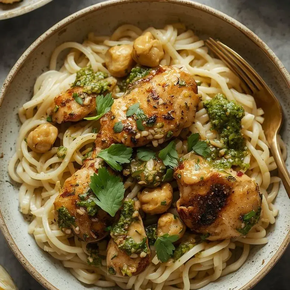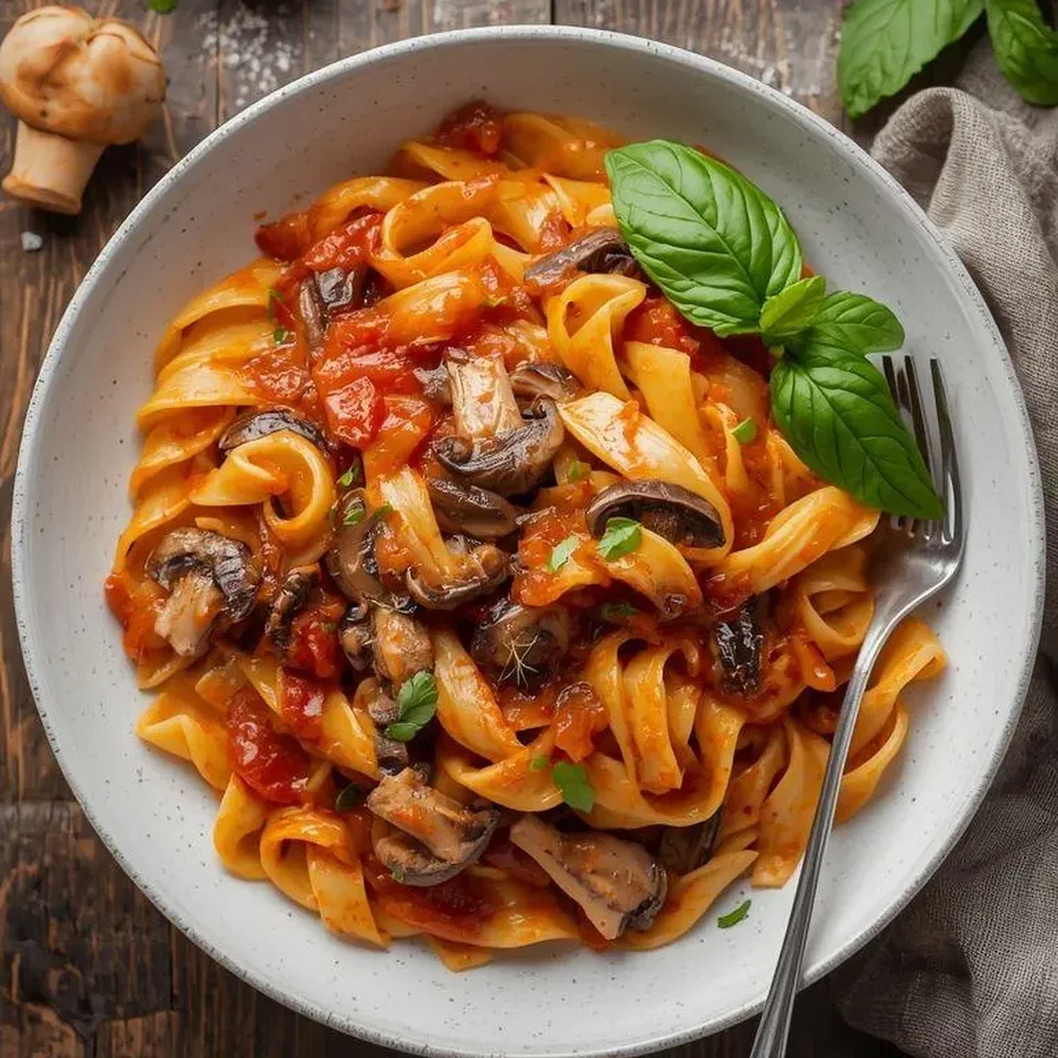 Makaron z kurczakiem i pieczarkami w sosie pomidorowym