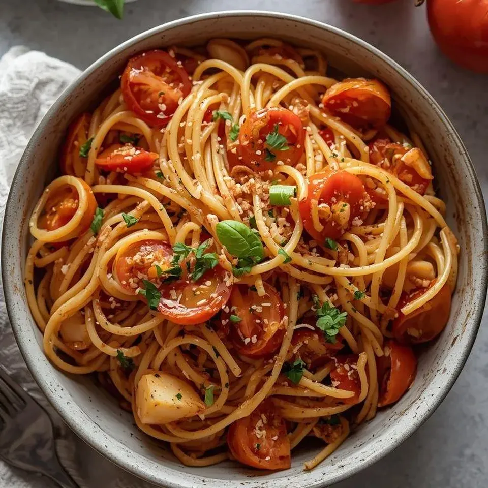 Spaghetti z warzywami i małymi tartami jabłkowymi