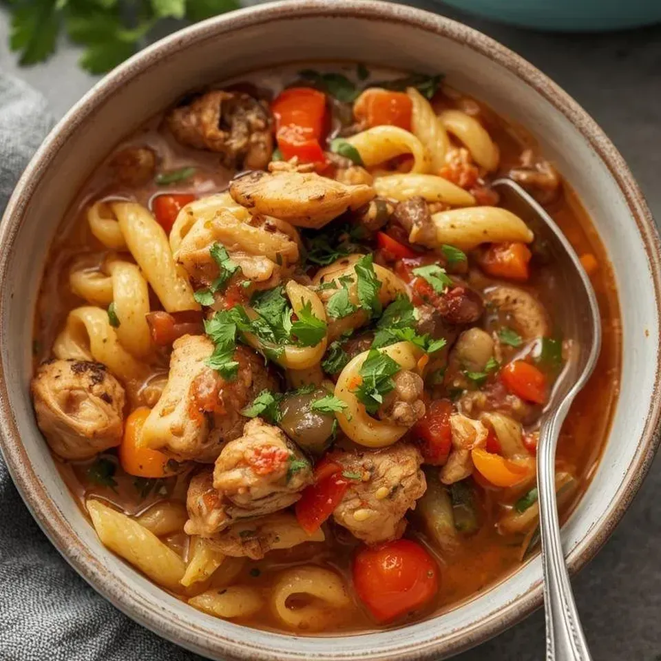 Gulasz jednogarnkowy z kurczaka, z warzywami i makaronem