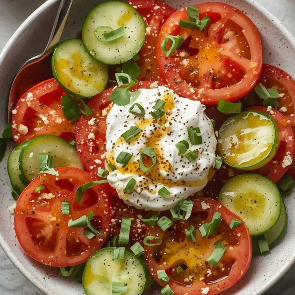 Sałatka z pomidorów, ogórków, fetą i jogurtem waniliowym