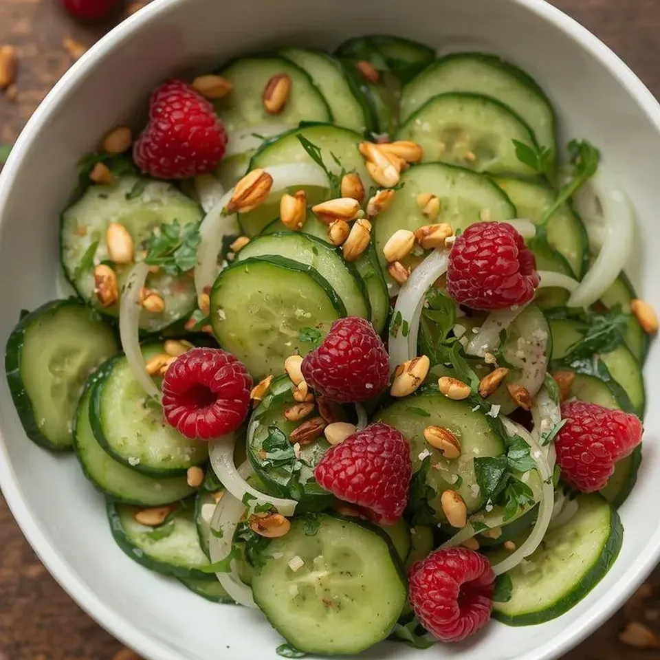 Sałatka ogórkowa z orzeszkami piniówkami i deserem malinowym