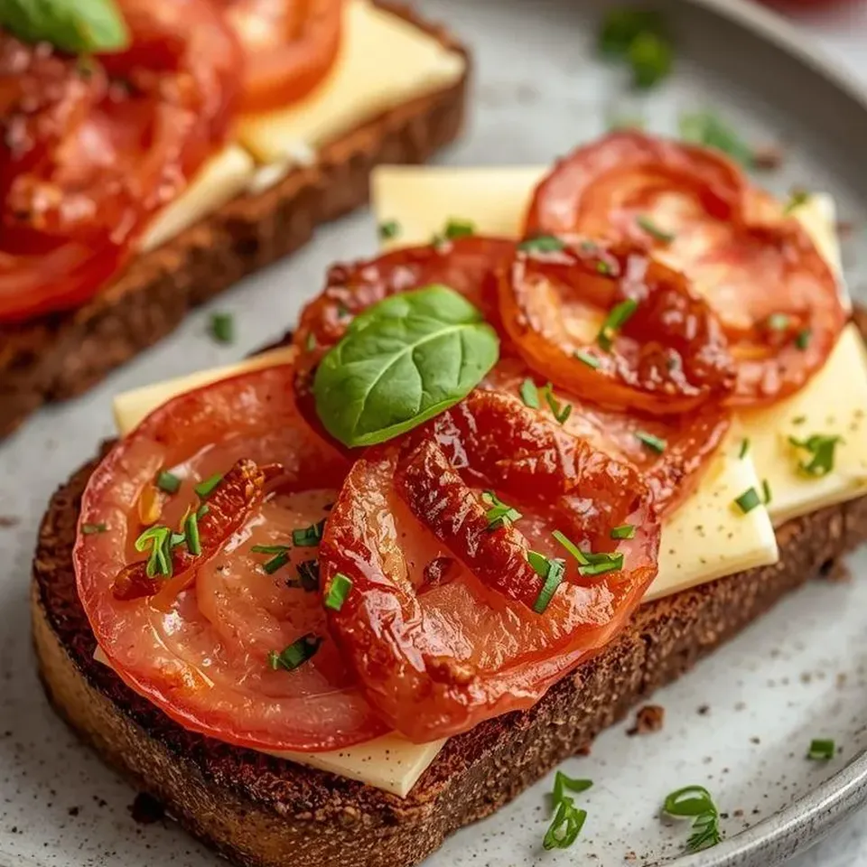 Tosty pełnoziarniste z serem, pomidorem i pieczonym schabem