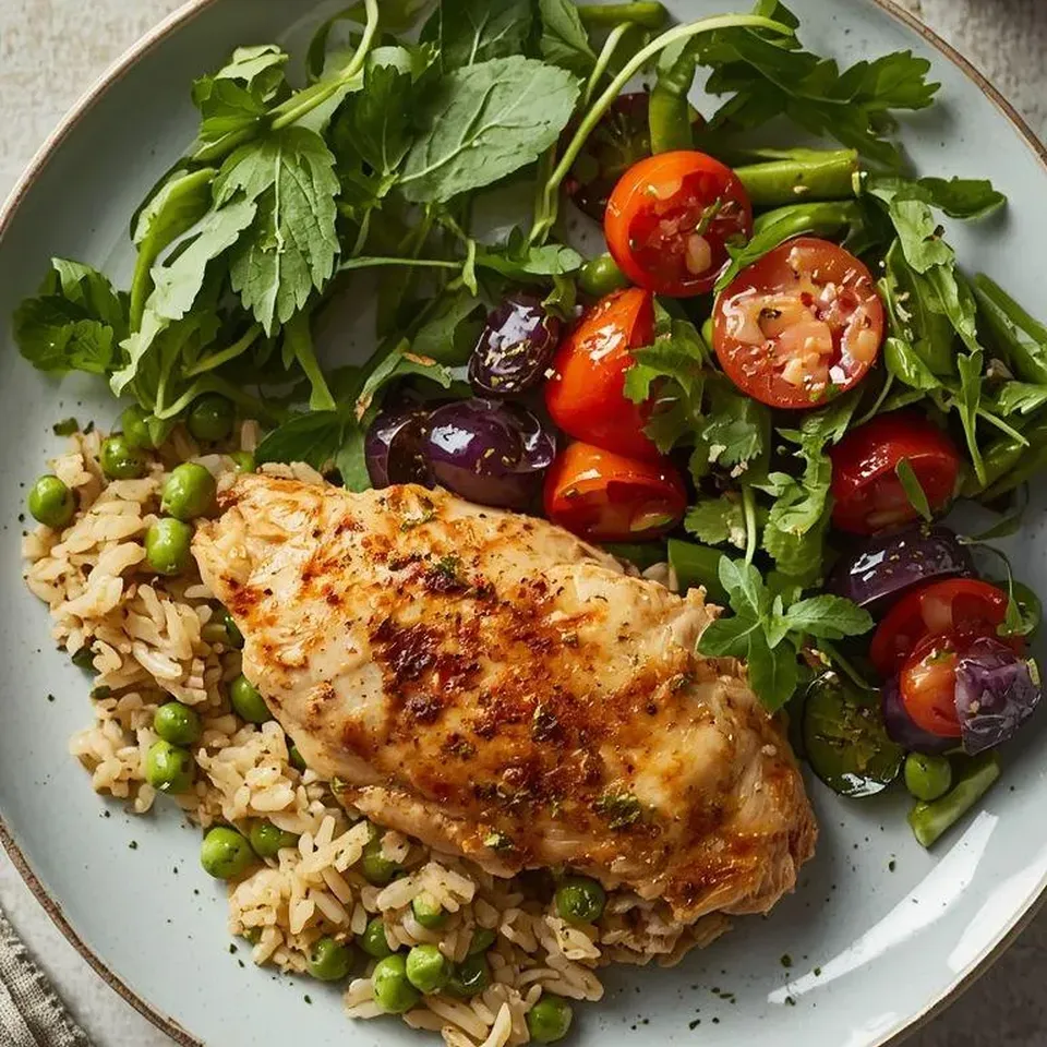 Faszerowana groszkiem pierś kurczaka z ryżem i surówką
