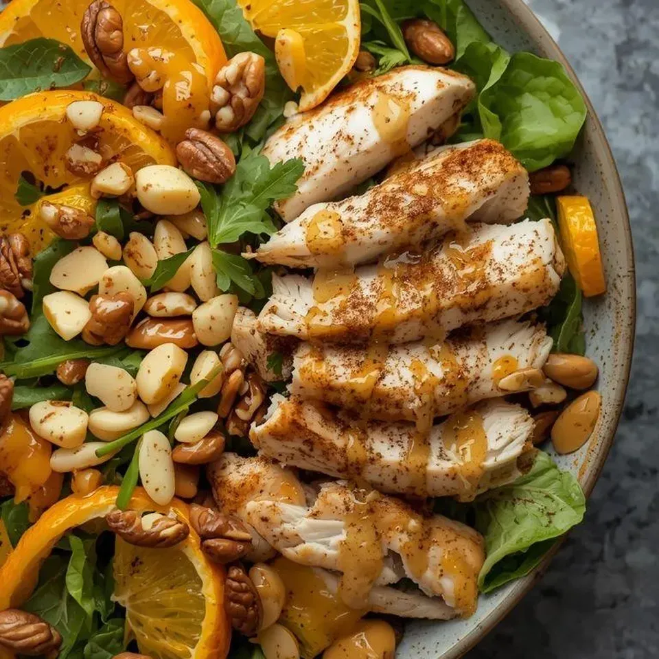 Sałatka z kurczakiem, pomarańczą i orzechami z miodowo-musztardowym sosem z dodatkiem cynamonu