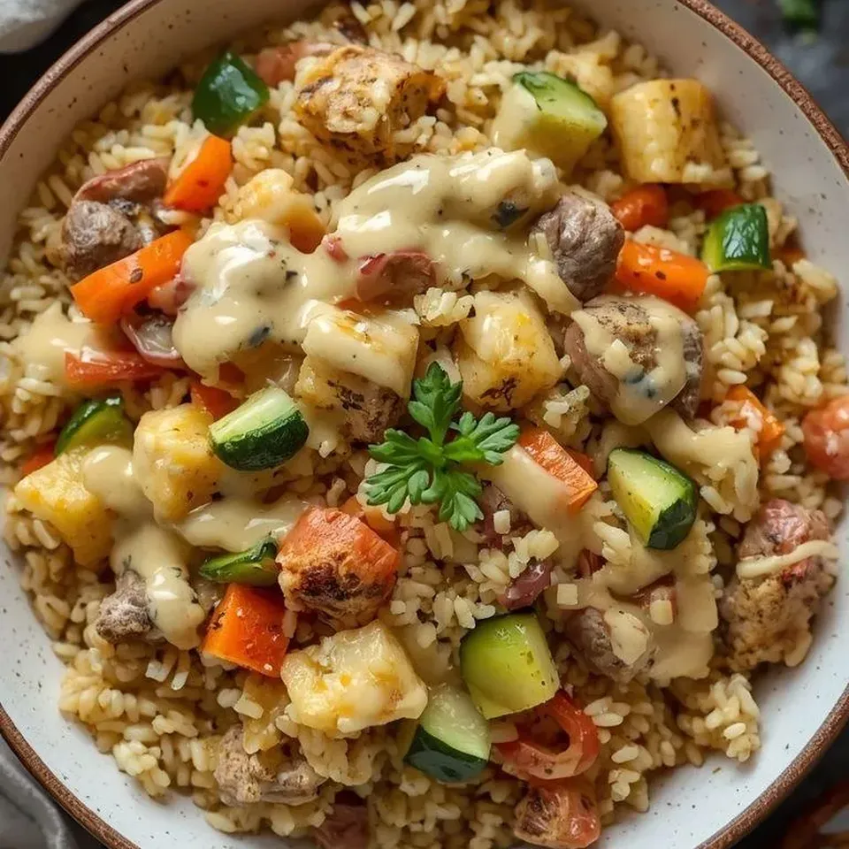 Pyszny bezmięsny ryż z warzywami i kremowym sosem