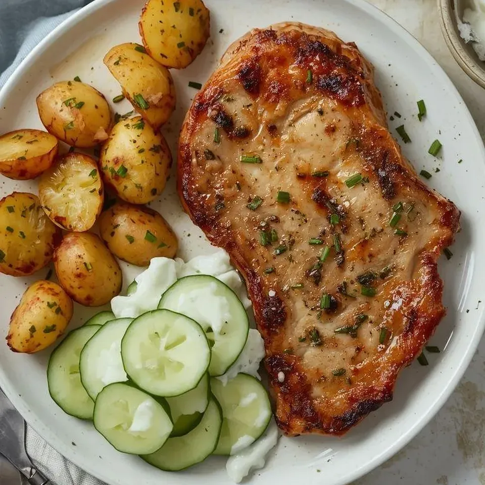 Sznycel wieprzowy z ziemniakami, groszkiem, marchewką i jogurtem pomarańczowym
