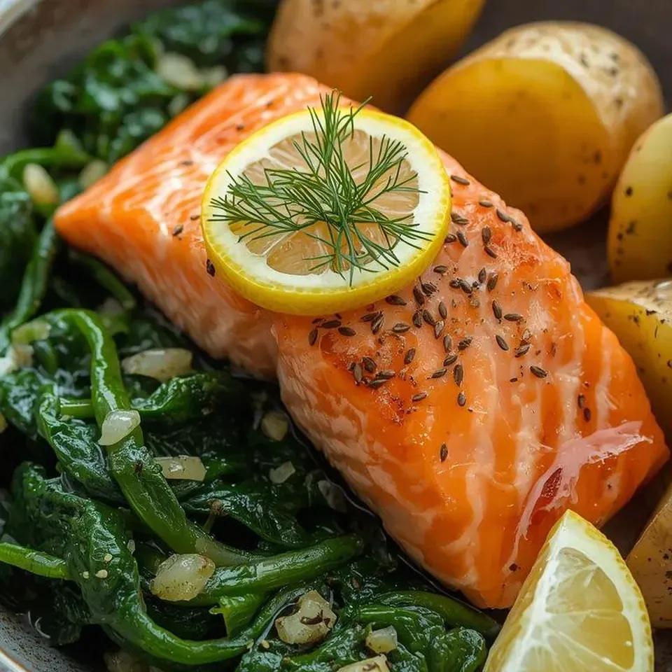 Łosoś ze szpinakiem, koperkiem cytrynowym i ziemniakami