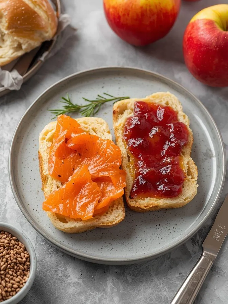 Przekrój bułki na pół, zapiecz je, posmaruj lekko masłem i jedną połowę pokryj łososiem, a drugą dżemem.
