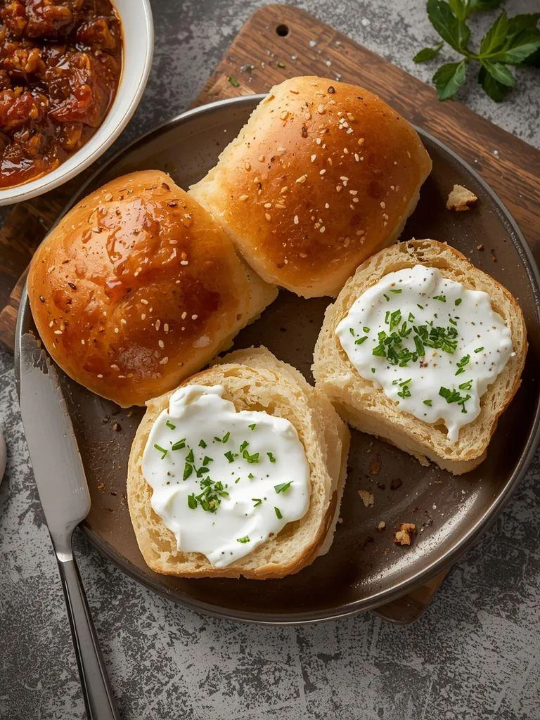 Twaróg wymieszać z drobno posiekanymi ziołami, solą i pieprzem, a następnie posmarować nim pozostałe bułki.