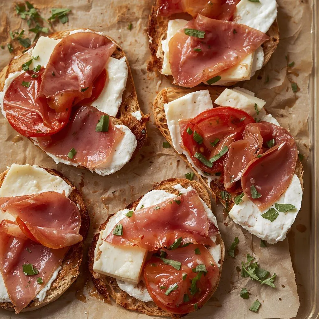 Na wierzchu każdego kawałka połóż szynkę, pomidora i plasterki sera camembert.