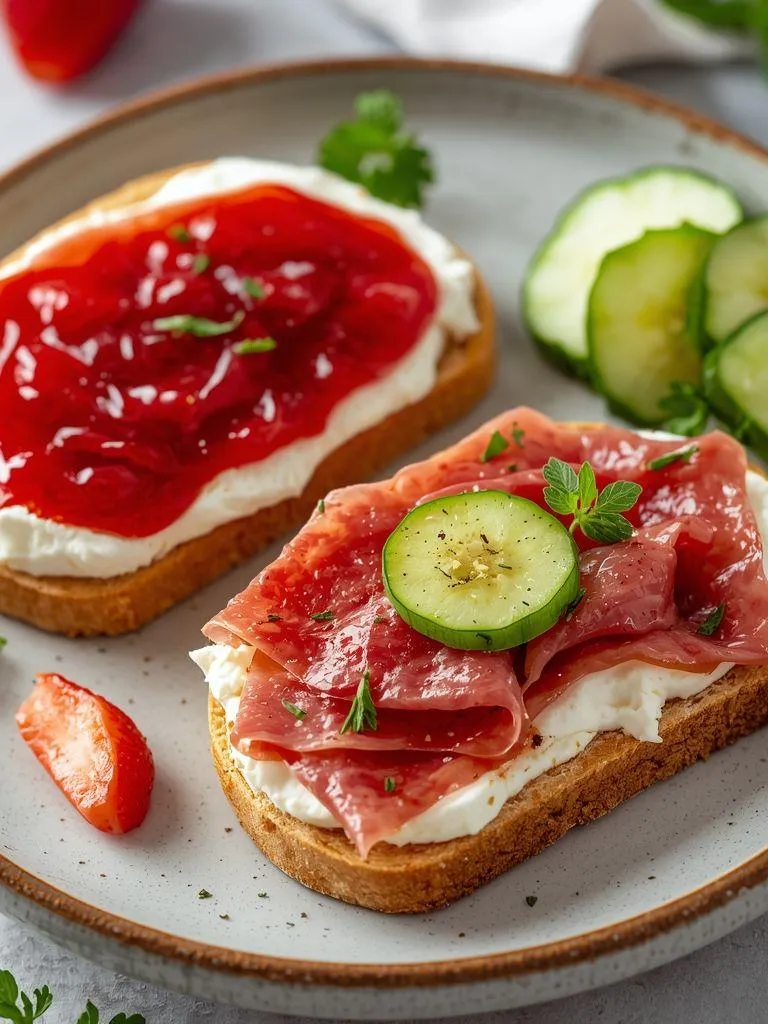 Chrupkie pieczywo z dżemem truskawkowym i salami