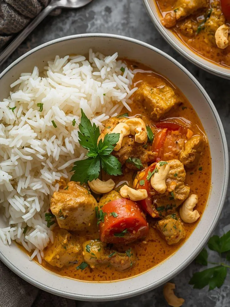 Orzechy nerkowca posiekaj grubo i upraż je na patelni bez tłuszczu. Ryż i curry włóż do misek i podawaj posypane orzechami nerkowca.