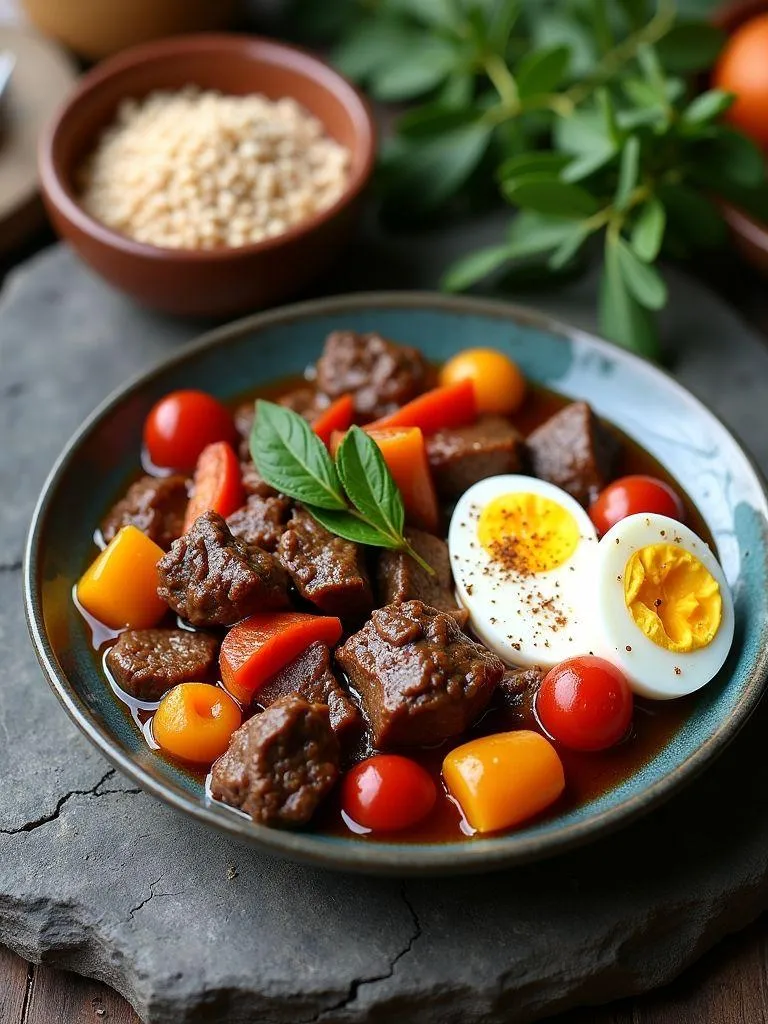 Dodaj koncentrat pomidorowy i ok. 100 ml wody lub bulionu. Wrzuć liść laurowy i ziele angielskie. Duś pod przykryciem na małym ogniu ok. 40–45 minut (aż mięso będzie miękkie). W razie potrzeby dolej trochę wody.