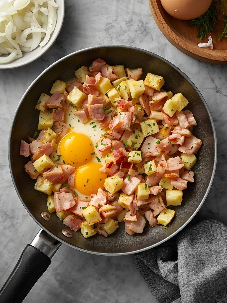 Po 2-3 minutach dodaj szynkę i przypiecz całość jeszcze przez minutę na średnim ogniu.
