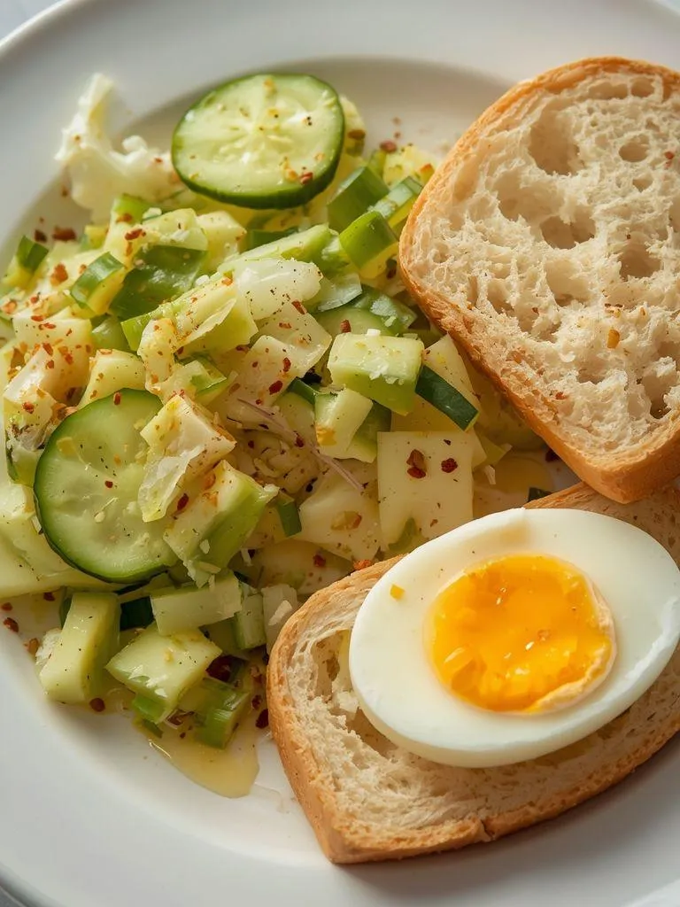 Ogórka pokrój na plastry lub kawałki. Sałatę porwij rękoma na małe kawałki, wymieszaj z ogórkiem, oliwą i przyprawami. Sałatkę wraz z jajkiem zjedz z chlebem.