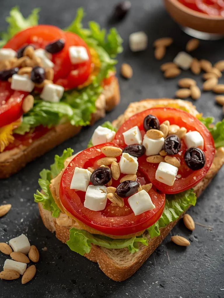 Pieczywo posmaruj hummusem. Pomidorki przekrój na połówki i zmieszaj z porwaną na mniejsze kawałki sałatą oraz oliwkami. Dodaj słonecznik i pokrojoną w mniejsze kawałki mozzarellę. Kanapkę zjedz z sałatką.