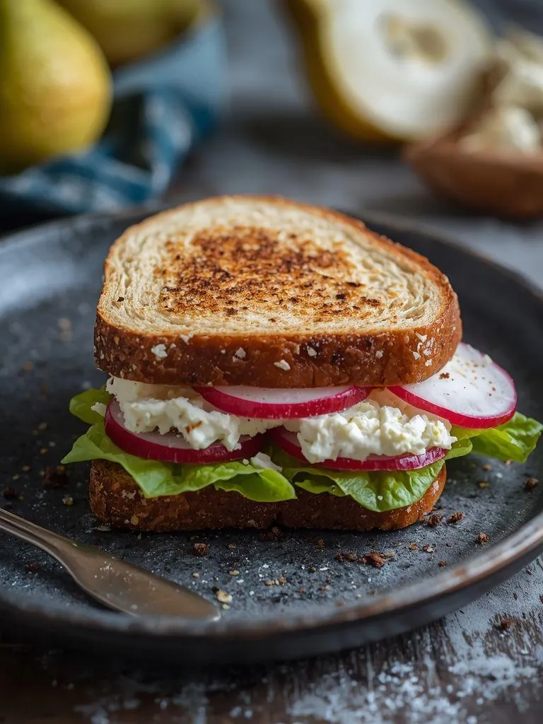 Kanapka z twarogiem i rzodkiewką + gruszka