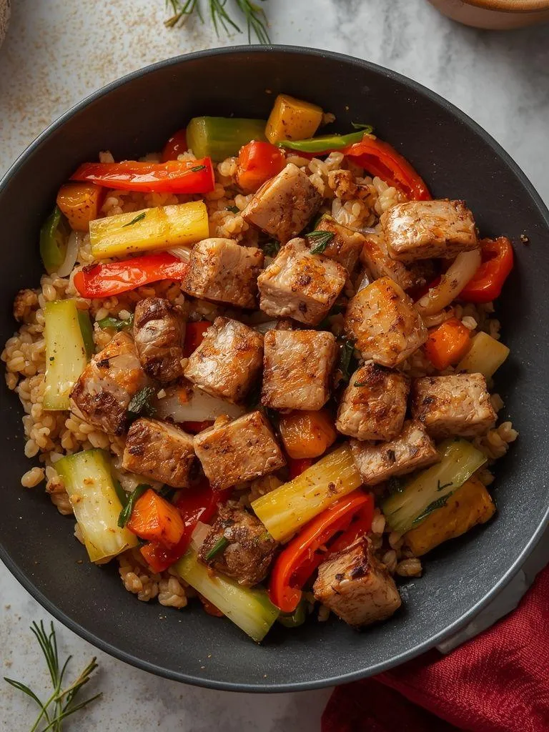 Kasza gryczana z piersią z indyka i warzywami na patelnię