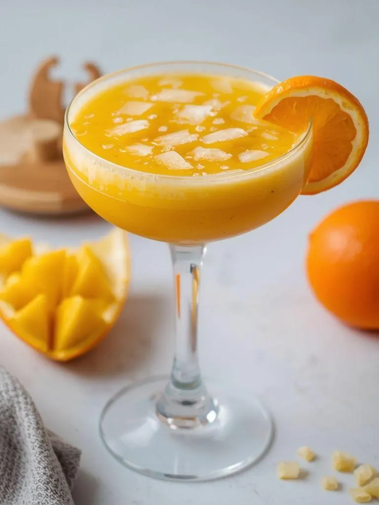 Połowę Mango obierz i pokrój w kostkę, umieść w misie blendera. Dodaj mleko , jogurt i zblenduj. Pomarańczę zjedz jako dodatek odrębnie.