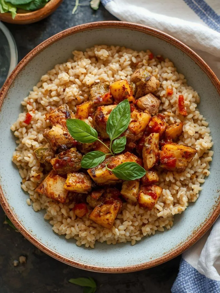 Na talerz napierw wyłóż kaszę i polej mięsem.
