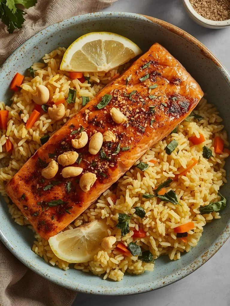 Łosoś z ryżem curry i sałatką