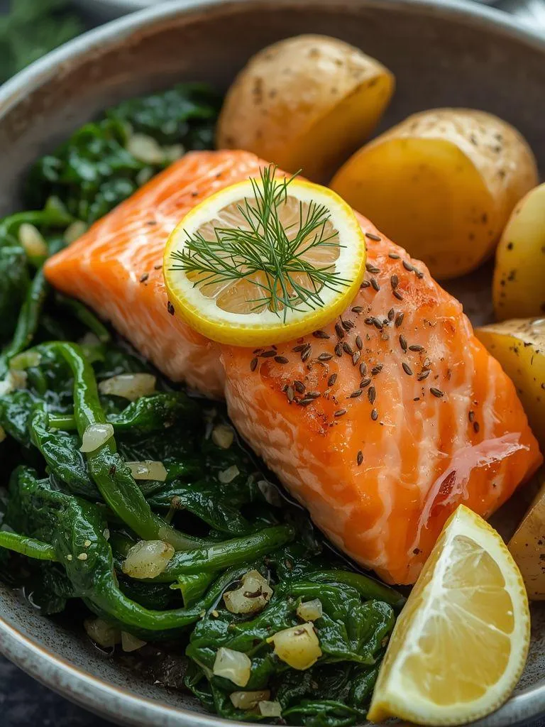 Łosoś ze szpinakiem, koperkiem cytrynowym i ziemniakami