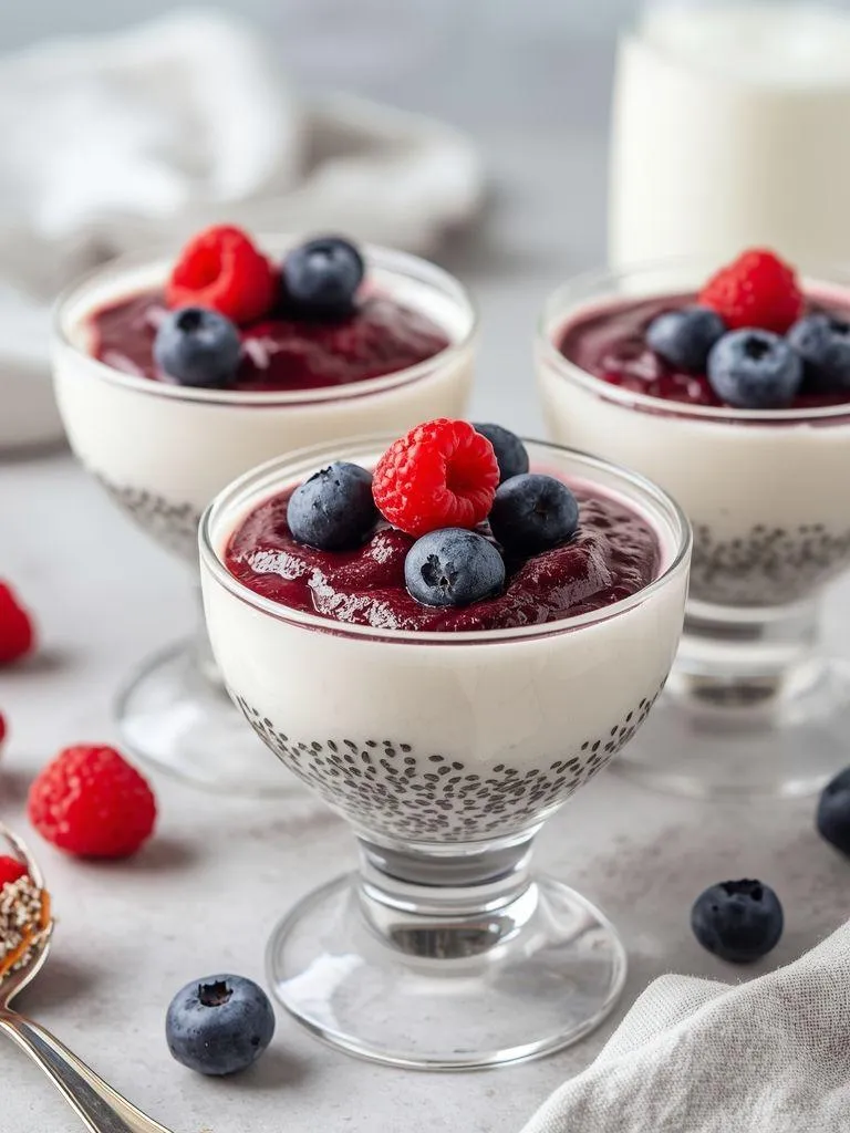 W misce wymieszaj jogurt z 2 łyżkami erytrytolu z nasionami chia. Rozlać mieszaninę do 4 szklanek i wstawić do lodówki na 8 – 12 godzin.