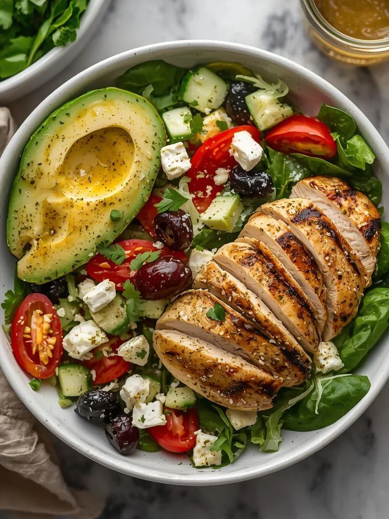 Podziel sałatę, ogórki, pomidory, awokado, fetę i oliwki na cztery miski. Na wierzchu połóż pokrojonego kurczaka, a następnie skrop dressingiem.