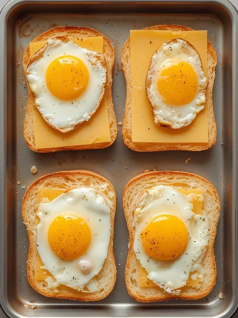 Na każdej kromce chleba połóż pół plasterka sera, a następnie włóż surowe jajko.
