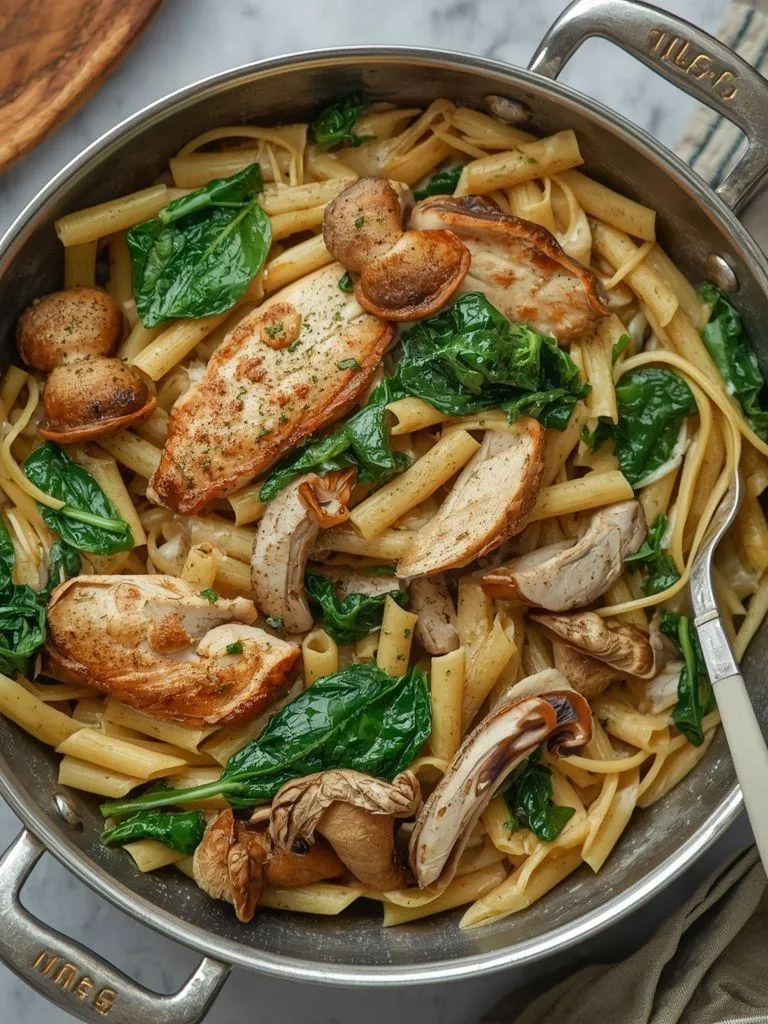 Makaron z kurczakiem, kurkami i szpinakiem w sosie śmietanowym