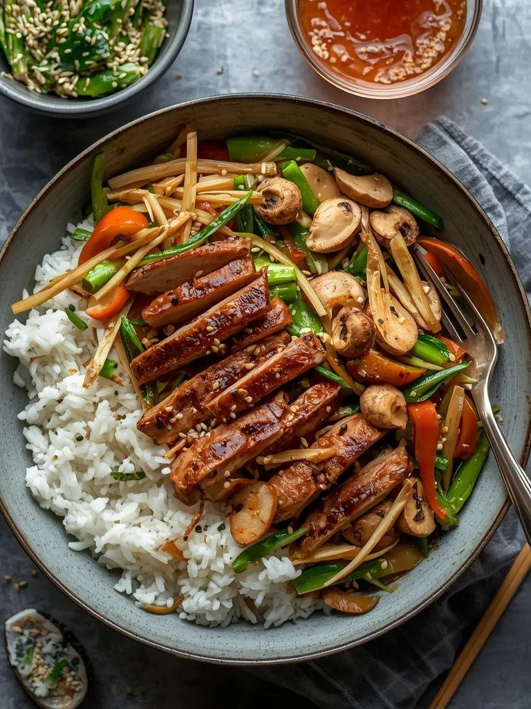 Patelnia z kiełkami azjatyckimi, ryżem i polędwicą wieprzową