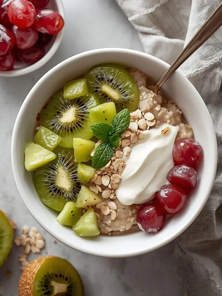 Kiwi obierz ze skóry, pokrój na kawałki i przełóż do małej miski.