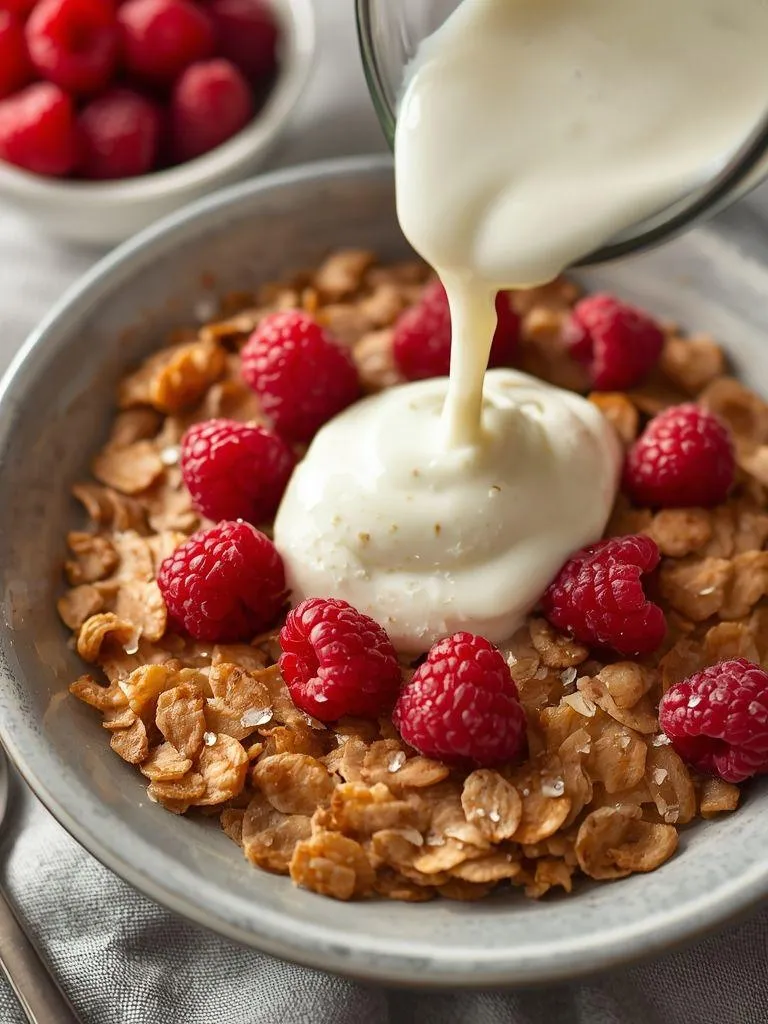 Rozłóż maliny na płatkach owsianych i polej je jogurtem jabłkowym.
