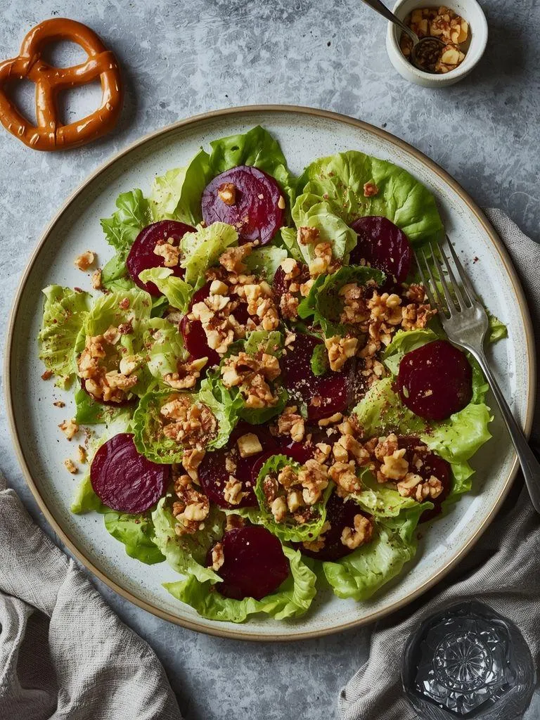 Na 2 dużych płaskich talerzach ułoż plasterki szpinaku warzywnego i buraków. Sałatkę polej dressingiem i posyp orzechami włoskimi. Wystarczy 1 precel.