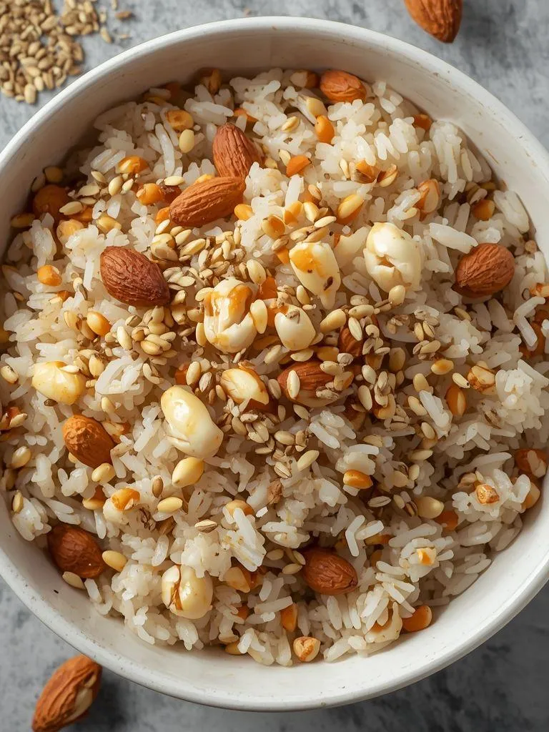 Dodaj do niego posiekane orzechy. Wymieszaj całość, posyp sezamem i siemieniem lnianym.