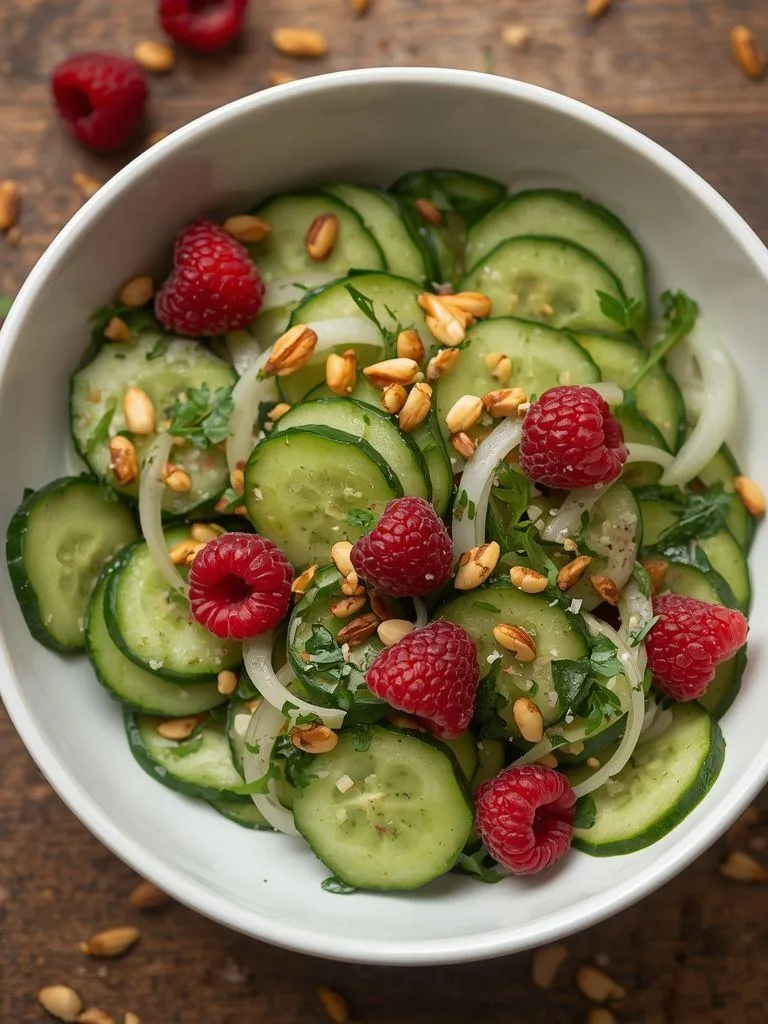 Sałatka ogórkowa z orzeszkami piniówkami i deserem malinowym
