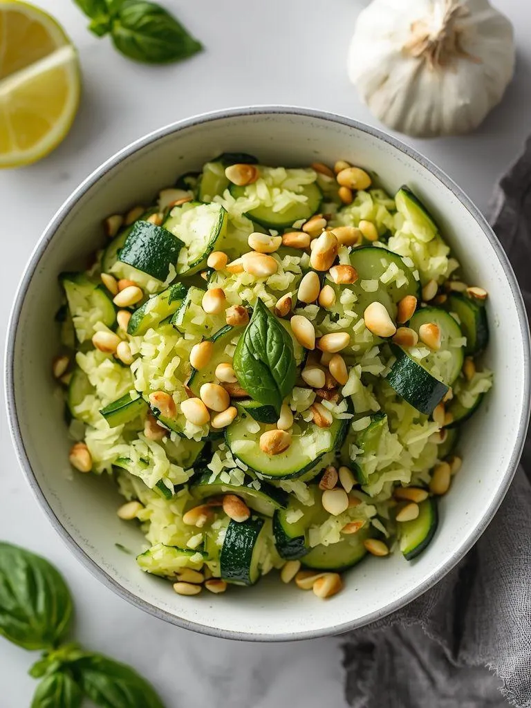 Obierz i przekrój na pół dziesięć ząbków czosnku, a połówki wcieraj w misce do sałatki. Drobno starte cukinię dodać do miski, wymieszać z dressingiem i posypać orzeszkami piniowymi.
