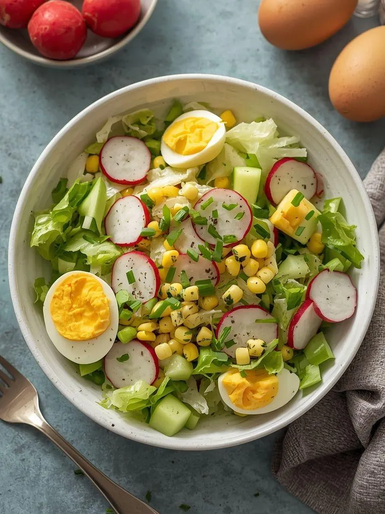 Sałatę przerwij na kawałki rękomi (nie nożem), dodaj ogórek, rzodkiew, szczypiorek i ulubione zioła.