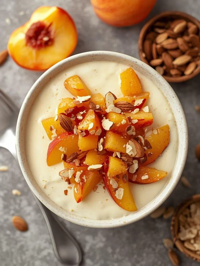 Przełóż całość do miski lub szklanki, na górę ułóż resztę brzoskwiń, migdały i posyp odrobiną Müsli.