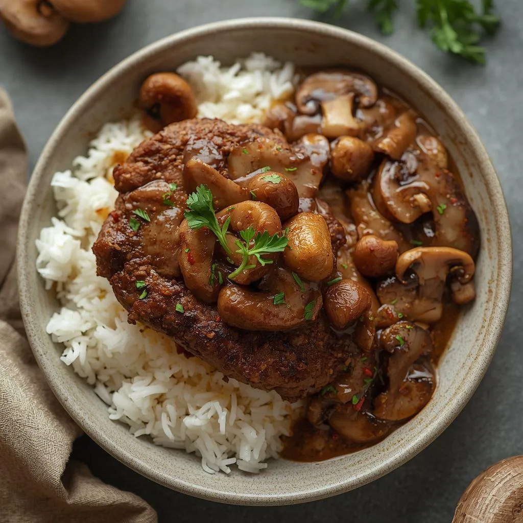Polej sosem ryż i stek na talerzu i udekoruj natką pietruszki.