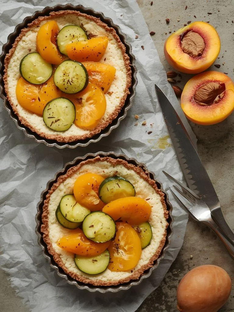 Rozłóż równomiernie plasterki cukinii i 4 połówki moreli na cieście i piecz przez kolejne 15 minut.