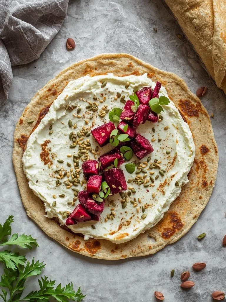 Placek tortilli posmaruj twarożkiem, posypać pestkami, zwiń tortillę oraz owiń folią spożywczą. Schowaj do lodówki na przynajmniej 10 minut.