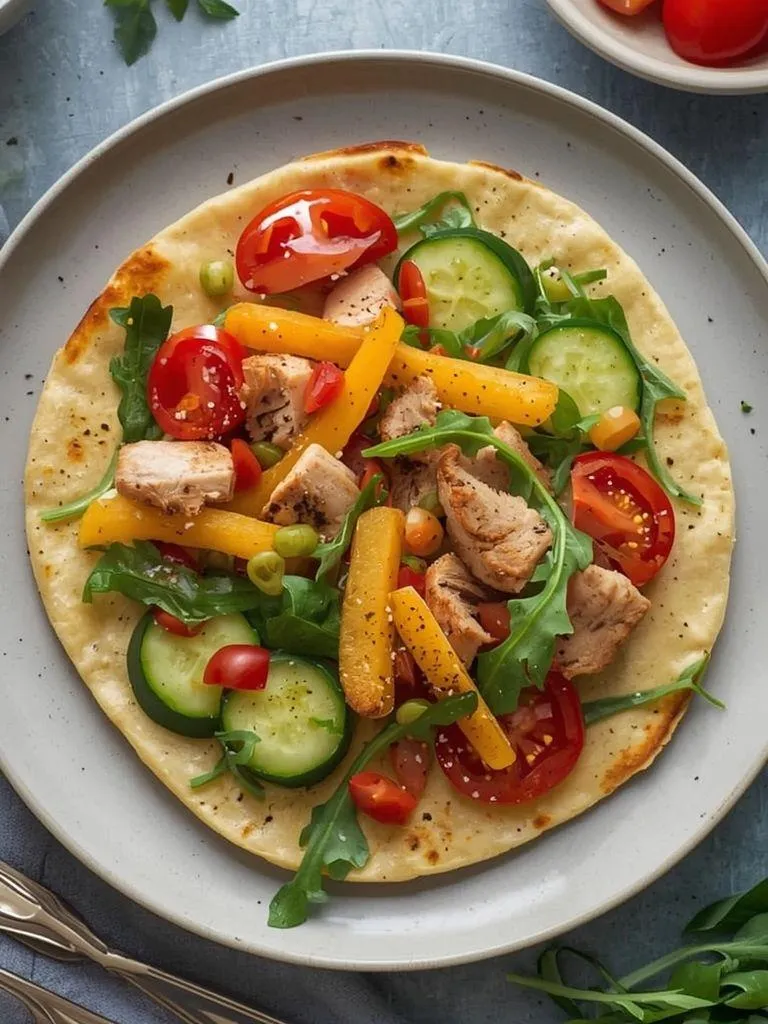 Tortilla z pieczonym indykiem, rukolą, pomidorem, ogórkiem konserwowym i papryką na zimno